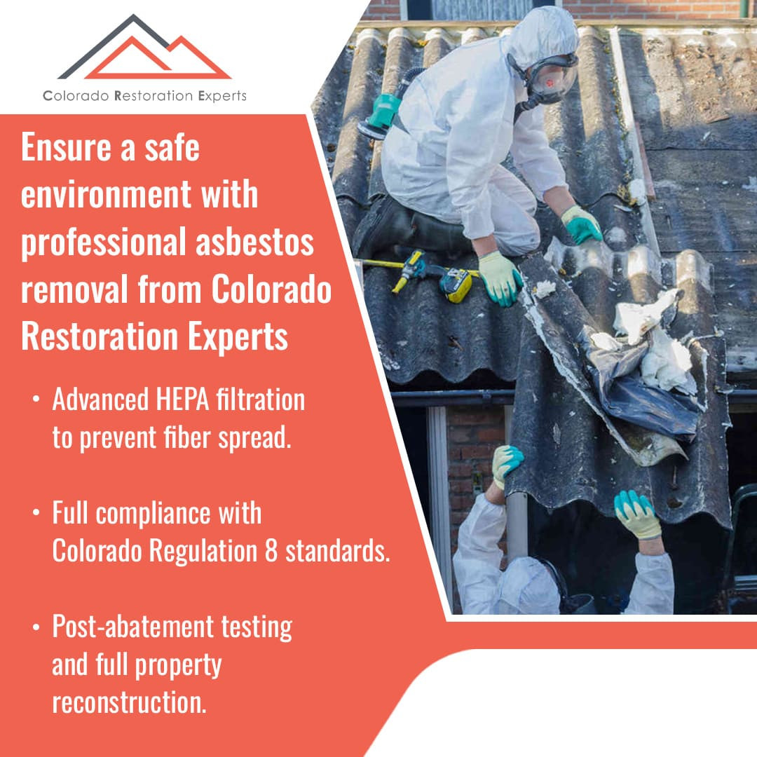 Colorado Restoration Experts handles abatement of asbestos in Colorado Springs according to state and local regulations, including Colorado Regulation 8. This ensures all removal, containment, and disposal practices meet legal standards. Local experience allows the team to identify high-risk areas in older homes and commercial buildings and coordinate efficiently with inspectors and permitting authorities.